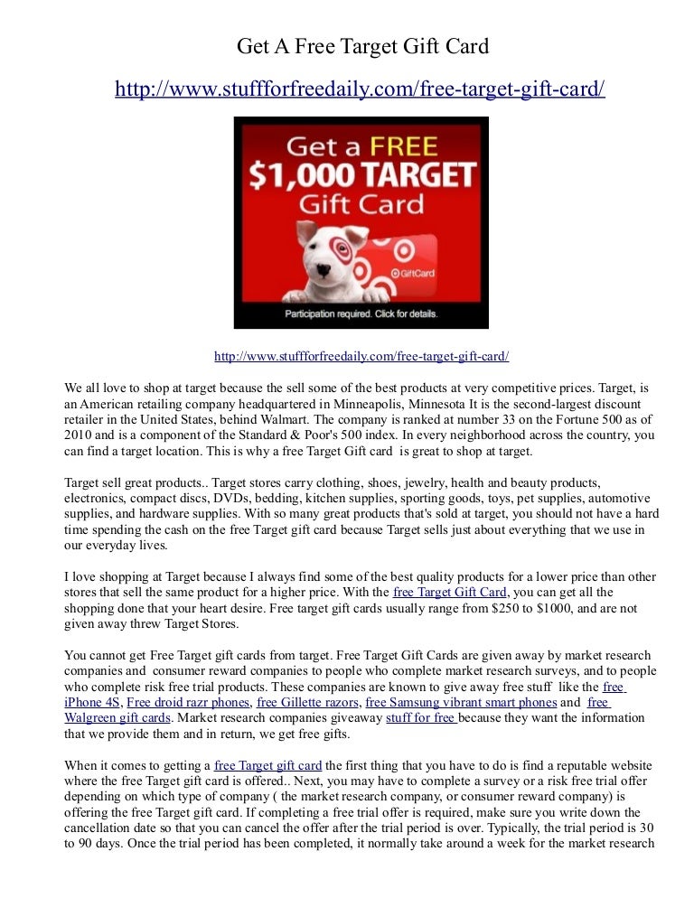 Get Free Target Gift Cards on InboxDollars Shoppers can also get free Target gift cards too. Reward sites and apps like InboxDollars, Swagbucks, MyPoints, and Tada pay consumers when they complete tasks like scanning receipts, taking surveys, checking into stores, or couponing. Consumers can earn rewards and that they redeem for a free Target gift card at checkout. Free Target $10 Gift Card - Rewards Store | Swagbucks Details on the Free Target $10 Gift Card. Target GiftCards® let you shop for thousands of items at more than 1,700 Target and SuperTarget® stores, as well as online at Target.com. To redeem a Target eGiftCard in stores, simply show the barcode on your web-enabled mobile phone (Target stores cannot accept a printed copy of a Target eGiftCard ... Target GiftCards Target GiftCards purchased on Target.com or in the Target app (Physical Target GiftCards, Mobile Target GiftCards and Target eGiftCards): $10, $20, $25, $50, $75, $100 & $200, and the ability to add in a custom value amount between $5 - $500. In Store You can purchase physical Target GiftCards at any Target store during checkout. Target.com
