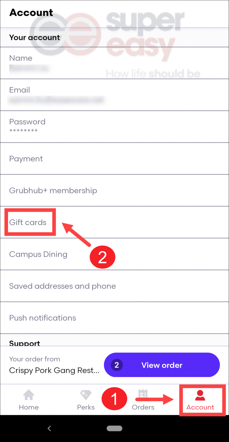 How to Use A Grubhub Gift Card - PC & Mobile - Super Easy Add/ Redeem a gift card through the app 1) Open your Grubhub app. 2) Tap on Account on the bottom-right corner. Then select Gift cards. 3) Enter your gift card code to add it to your account. After you've done these, you can choose to pay for your order using a gift card upon checkout. You might also like: valid Grubhub promo codes and cash back