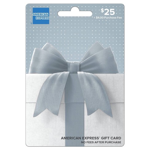 American Express Gift Card - $25 + $4 Fee : Target American Express Gift Card - $25 + $4 Fee $29When purchased online In Stock Add to cart About this item Highlights Enjoy using American Express® Gift Cards virtually everywhere American Express® Cards are accepted United States, U.S. Virgin Islands and Puerto Rico. No fees after purchase Funds do not expire